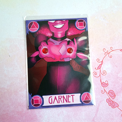 Digitally drawn, printed in a limited number, hand cut and with a backing made of toned cardstock (red for Garnet. purple for Amethyst, cream for Pearl), then decorated with acrylic gems and plastic half pearls/pearl maker fluid. Comes in protective sleeves.