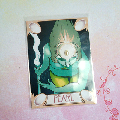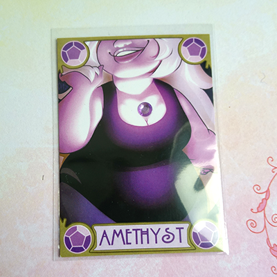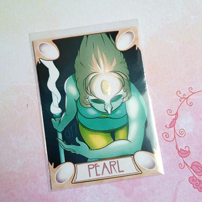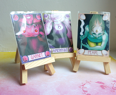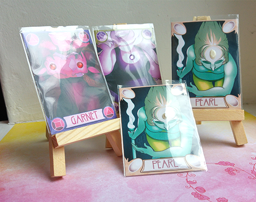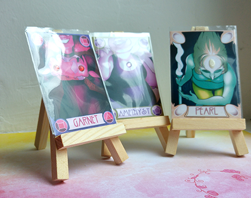 Digitally drawn, printed in a limited number, hand cut and with a backing made of toned cardstock (red for Garnet. purple for Amethyst, cream for Pearl), then decorated with acrylic gems and plastic half pearls/pearl maker fluid. Comes in protective sleeves.